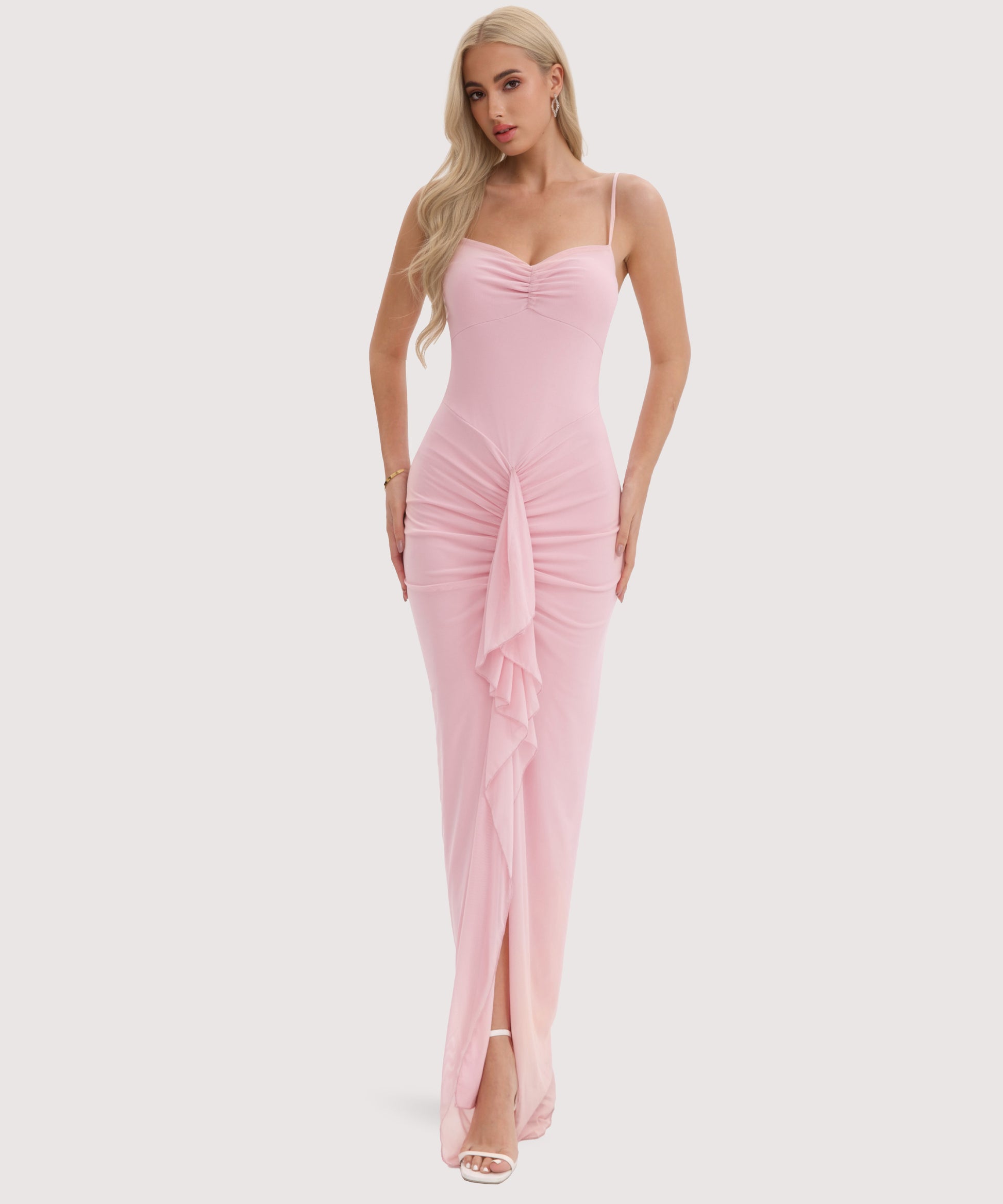 Spaghetti Strap Maxi Dress with Front Slit and Ruffle-Pink